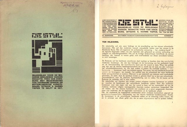 Aquel primer número de De Stijl fechado el 1 de octubre de 1917, vino acompañado con un texto en su portada (diseñada por Vilmos Huszár) que decía: “De Stijl, revista de las artes visuales modernas, edición Theo van Doesburg con la participación de colaboradores nacionales y extranjeros. Edición Harms Tiepen en Delft en 1917”. Será el propio Van Doesburg quien escribirá la editorial titulada “A modo de introducción” (“Ter inleiding”), fechada en Leyden el 16 de junio, en cuyas primeras líneas se anunciaba que “Esta revista quiere ser una contribución al desarrollo de una nueva conciencia estética”. También colaborarán Bart van der Leck, Antony Kok y Jacobus Johannes Pieter Oud.