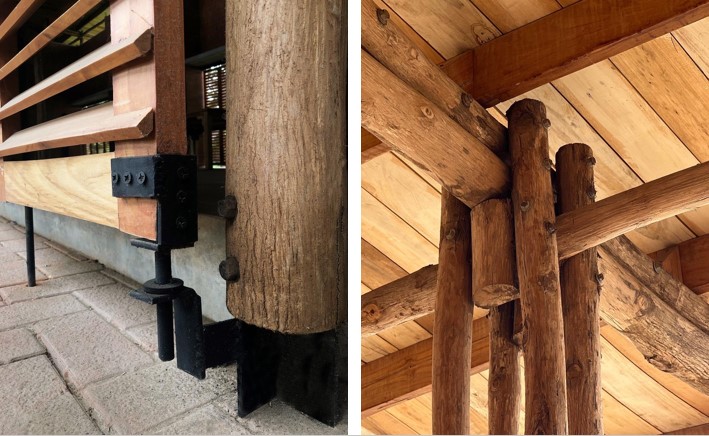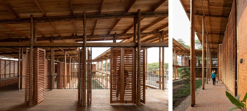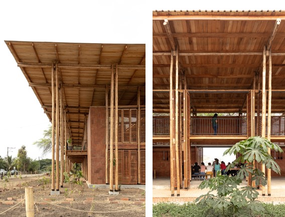 Como fundamento espacial que organiza la propuesta, “se propone un patio con vegetación endémica como lugar de encuentro y exposición que está contenido por dos naves laterales y una central; uno contiene aulas formativas teóricas, cafetería y servicios higiénicos; el otro, talleres de aprendizaje práctico, espacio de dormir, bodegas y una tienda para vender los productos desarrollados en la nave central donde se realizan los tejidos artesanales. (…) El frente principal es una galería productiva-expositiva que sirve como filtro del patio y como elemento para generar urbanidad hacia la calle. Mientras que la cara posterior se cierra hacia el espacio medianero para generar mayor seguridad. (…) Se plantea el uso de madera de teca rolliza como estructura principal comúnmente utilizada para los pilotes de las viviendas palafíticas en zonas vulnerables de la región por su dureza y durabilidad, soportando la cubierta y el piso en planta alta. (…) Las paredes de ladrillo están trabajadas con tejido de espina de pez y rigidizados por la propia forma de los muros trabados. Las puertas de chazas abatibles de madera son utilizadas para el control de la ventilación, iluminación y vinculación entre el exterior e interior. (…) Para la iluminación natural y la ventilación se utilizan puertas de celosía plegable de madera para controlarlas, trabajando también como enlace entre el exterior y el interior. Esto, centrado en un bajo consumo energético, teniendo en cuenta la alta humedad y las temperaturas en la zona”.