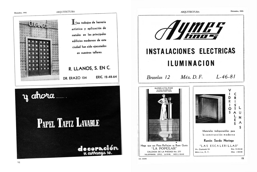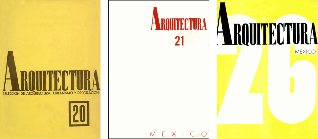 En sus inicios, la revista (de periodicidad trimestral) apareció bajo el nombre de Arquitectura con el subtítulo “Selección de Arquitectura, Urbanismo y Decoración”. La portada del nº1 (diciembre de 1938) que ilustra nuestra postal del día de hoy así lo confirma, conservándose de esa manera hasta el número 20 (abril de 1946). Entre los números 21 al 25 se presentó tan solo con el título de Arquitectura, indicando “México” en la parte inferior, para después juntar ambos a partir del número 26 en enero de 1949. Por otro lado, fue en el número 27 (abril de 1949) cuando, tras 10 años de circulación ininterrumpida, quitaron el subtítulo original en el sumario señalándose además a la recién estrenada empresa propietaria (“Editorial Arquitectura, S.A.», constituida por un reducido grupo de arquitectos), y en el número 34 de junio de 1951 se agregaría México como subtítulo en el sumario. En todo caso la tipografía de la palabra Arquitectura siempre sería la predominante.