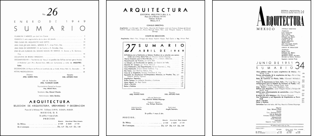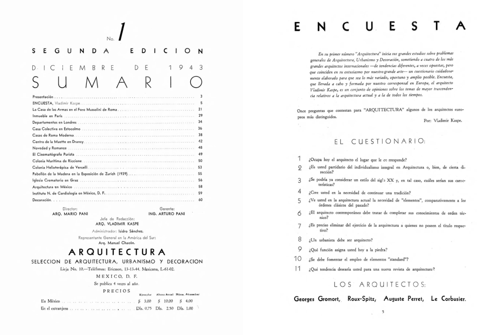 Del “Sumario” del número 1 de Arquitectura/México vale la pena resaltar, además de la “Presentación” de Pani ya citada, una interesante «Encuesta» conformada por once preguntas elaborada por Vladimir Kaspé quien como corresponsal en París la hizo llegar a “cuatro de los más grandes arquitectos internacionales -de tendencias diferentes, a veces opuestas, pero que coinciden en su entusiasmo por nuestro grande arte-“ (Georges Gromort, Roux-Spitz, Auguste Perret y Le Corbusier), con la intención de obtener opiniones “sobre los temas de mayor trascendencia relativos a la arquitectura actual y a la de todos los tiempos”.