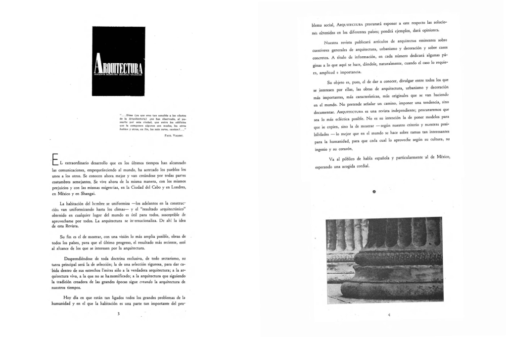 Como respaldo a lo señalado, la «Presentación» del primer número dice textualmente: «El extraordinario desarrollo que en los últimos tiempos han alcanzado las comunicaciones, empequeñeciendo al mundo, ha acercado los pueblos los unos a los otros… La habitación del hombre se uniformiza… La arquitectura se internacionaliza. De ahí la idea de esta Revista. Su fin es mostrar, con una visión lo más amplia posible, obras de todos los países, para que el último progreso, el resultado más reciente, esté al alcance de los que se interesan por la arquitectura». Y, además: “Desprendiéndose de toda doctrina exclusiva, de todo sectarismo, su tarea principal será la de selección; la de una selección rigurosa, para dar cabida dentro de sus estrechos límites sólo a la verdadera arquitectura… No pretende señalar un camino; imponer una tendencia, sino documentar. (…) No es su intención la de poner modelos para que se copien, sino la de mostrar… lo mejor que en el mundo se hace sobre ramas tan interesantes para la humanidad…”.
