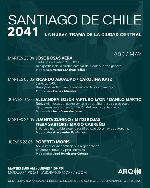 La Escuela de Arquitectura UCAB se honra en presentar el Ciclo de Charlas del Taller de Proyectos “Santiago de Chile 2041. La nueva trama de la ciudad central”, que se desarrollará del 28 de abril al 28 de mayo, en modalidad presencial y online. El ciclo está organizado por el profesor José Rosas Vera, referente en estudios urbanos y en el análisis de las transformaciones contemporáneas de Santiago de Chile, y cuenta con la participación de cuatro oficinas de arquitectura invitadas, responsables de proyectos urbanos de alto impacto en la ciudad.
