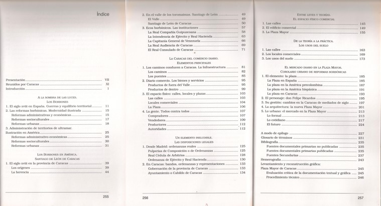 Como siempre suele ocurrir, el índice es la mejor guía para conocer los derroteros que siguió la investigación y la manera como fue estructurada. En tal sentido, cuenta con una esclarecedora “Introducción” para luego dividirse en dos grandes bloques: “Los ejidos de Caracas entre 1594 y 1830” y “Los ejidos de Caracas entre 1830 y 1864”, dejando claro la autora que para los períodos comprendidos entre 1810-1830 y 1857-1864 “se localizó escasa información de fuentes primarias editadas, debido a que estos lapsos coinciden con la Guerra de Independencia y la Guerra Federal”.
