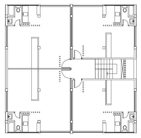 A los apartamentos se les accede por medio de una escalera interna, recedida en relación a la fachada, creando un pequeño balcón en el descanso, que garantiza la ventilación e iluminación. No se previó ascensor.