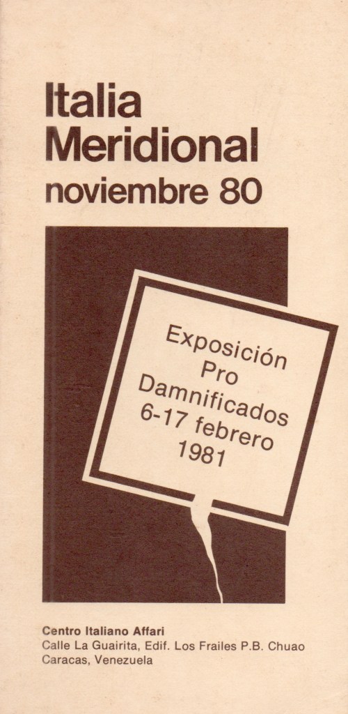 1980• Ante el catastrófico sismo ocurrido en noviembre en la Italia Meridional, afectando principalmente los municipios de Castelnuovo di Conza, Conza della Campania, Laviano, Lioni, Sant’Angelo dei Lombardi y Santomenna, un grupo de arquitectos de la Facultad de Arquitectura y Urbanismo de la UCV, con el apoyo del Centro de Información y Documentación, organizó una “Exposición-Subasta de Dibujos y Pinturas”, elaboradas expresamente por ellos sobre la temática, para, con la recaudación de la venta de las obras, aportar una ayuda a los afectados.