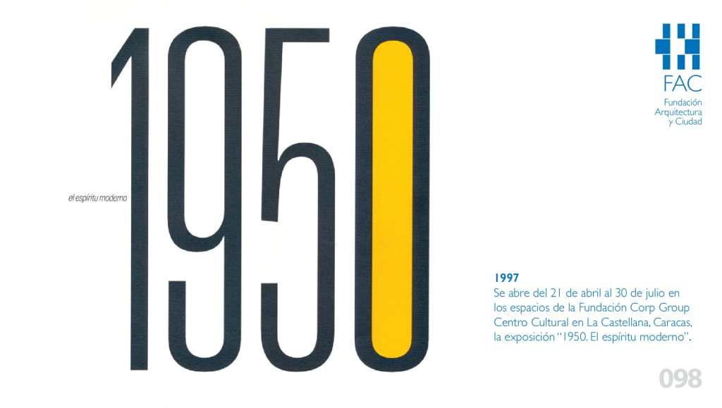Al referirse a la muestra que le dio origen, en el libro 1950. El Espíritu moderno se señala: “La exposición, que nació de una idea propuesta por el Centro Cultural a los arquitectos Hannia Gómez, William Niño Araque y Federico Vegas, se planteó llamar la atención sobre este singular período de la arquitectura moderna en Venezuela, y especialmente en Caracas a través de planos originales, fotografías, maquetas, material hemerográfico, muebles, objetos y documentales de la época”. Revisitar este acontecimiento a través de las páginas de la publicación nos coloca, una vez más, ante una demostración de lo que significa emprender y organizar de manera integral proyectos de esta envergadura los cuales desde hace muchos años han dejado de formar parte de nuestra vida cultural.