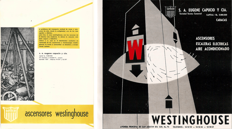 La comercialización en Venezuela de los productos destinados a la industria de la construcción elaborados por la empresa Westinghouse Electric Company LLC (anteriormente conocida como Westinghouse Electric Corporation), estuvo durante los años 1950 a cargo de la S.A. Eugene Capucio y Cía, Sociedad Técnica Comercial (SOTECO C.A.), ubicada inicialmente entre las esquinas de San Francisco y Sociedad del centro de Caracas y posteriormente en la avenida principal de San Agustín del Sur, anunciante desde su primer número de la que fue la primera revista de arquitectura producida en el país (1954): A, hombre y expresión, de cuyo número 2 proviene la imagen de nuestra postal del día de hoy.