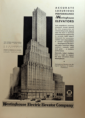 En 1922, Westinghouse instaló un ascensor sin engranajes en el Physical Education Building de Chicago; en 1931 instaló también en el Edificio Rockefeller, Nueva York, los ascensores más rápidos de la época con dispositivo de detención en hall automática, que alcanzaban una velocidad de 420 metros por minuto (1.378 pies/min.). Dentro de esta competencia sostenida con Otis Elevator Company, empresa pionera fundada en Nueva York en 1853 por Elisha Graves Otis (quien resolvió el principal problema que afectaba a los ascensores de esa época: el fallo del cable) y que fabricó el primer ascensor de servicio de pasajeros del mundo para un hotel de cinco pisos en Broadway, Nueva York, en el año 1857 accionado a vapor, Westinghouse perdería en 1930 la oportunidad de instalar los 58 ascensores del Edificio Empire State en Manhattan (en aquel momento el más alto del mundo), destinado a prestar servicio a unos 15.000 usuarios diarios, correspondiéndole a Otis hacerlo. Hoy en día Otis es el principal fabricante de ascensores y escaleras mecánicas en el mundo.
