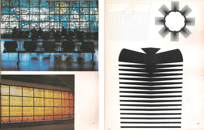El Arte en el Aeropuerto (breve explicación con fotografías de la contribución de los artistas plásticos Carlos Cruz-Diez y Héctor Poleo en el tratamiento de pisos y un vitral, respectivamente, a los que se suman Ángel Ateiza y Alfredo Suárez para el resto de los vitrales).