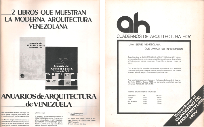 Los Anuarios de Arquitectura de Venezuela y ah. Cuadernos de Arquitectura Hoy, se promueven en las dos últimas páginas de la publicación. Sobre los primeros sabemos que llegó a salir un tercer volumen en 1988, seis años después del segundo, lo cual habla a las claras de las dificultades por las que los editores ya estaban pasando para garantizar la continuidad.