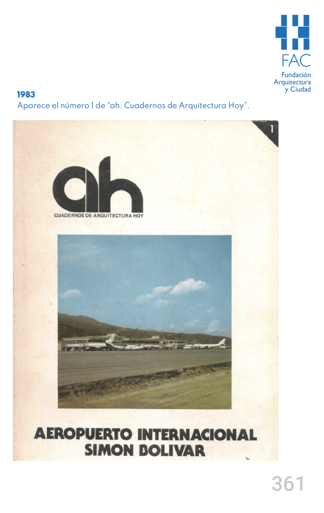 Con la aparición del número 1 de ah. Cuadernos de Arquitectura Hoy, Proimagen Editores C.A. daba cumplimiento a su ofrecimiento de aportar un nuevo producto (en este caso monográfico) que se sumaba a los dos Anuarios de Arquitectura Venezuela que habían publicado en 1981 y 1982. El primero de ellos venía acompañado de una presentación a cargo del arquitecto José Manuel Mijares, Presidente entonces del CAV; un texto del arquitecto y profesor Leszek Zawisza titulado “La arquitectura moderna en Venezuela”; y 50 proyectos descritos e ilustrados, divididos en 10 secciones: Viviendas Unifamiliares, Conjuntos de Viviendas Unifamiliares, Viviendas Multifamiliares, Conjuntos de Viviendas Multifamiliares, Educación, Comercio, Oficinas, Industria, Recreación y Turismo, y Servicios Públicos. El segundo incorporó textos e imágenes de 42 proyectos agrupados en 9 secciones: Viviendas Unifamiliares, Viviendas Multifamiliares, Conjunto de Viviendas, Educación y Cultura, Comercio, Oficinas, Industria, Recreación y Turismo, y Servicios Públicos e Institucionales, así como un ensayo de Ilmar Luks, profesor del Centro de Investigaciones Históricas y Estéticas de la Facultad de Arquitectura y Urbanismo de la UCV, titulado “Arte en la arquitectura venezolana contemporánea”.