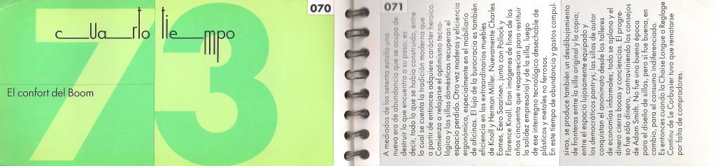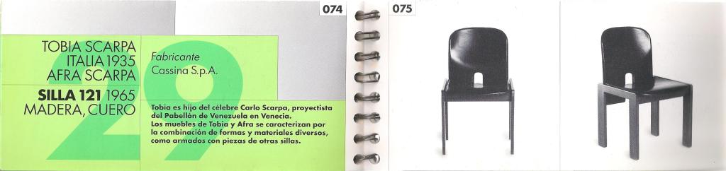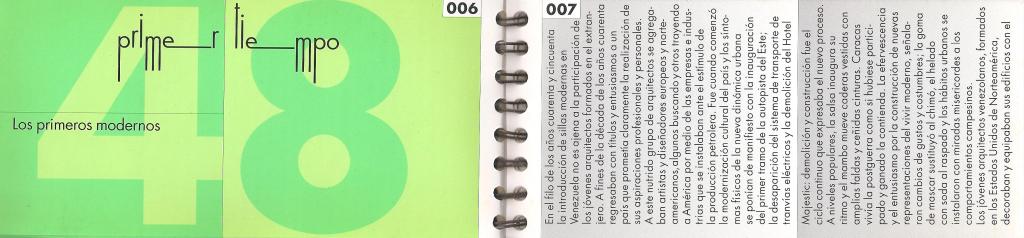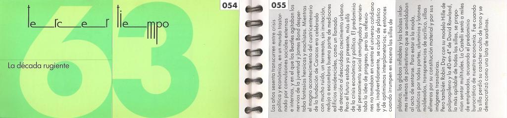 A “Detrás de las cosas” le siguieron “Chicho Mata. El hombre de Uribe” (1996); “DGV 70–80–90 Diseño Gráfico en Venezuela” (1996); “Hans J. Wegner. Hacedor de sillas” (1996); y “Sentados en un siglo. Emblemas cotidianos en Venezuela” (1997), de cuyo diminuto y extraordinario catálogo, diseñado por Álvaro Sotillo, impreso por Exlibris en un formato de 15 x 7 cms a modo de libreta con hojas unidas con un espiral metálico y en papel glasé, hemos reproducido la portada y contraportada para engalanar nuestra postal del día de hoy.