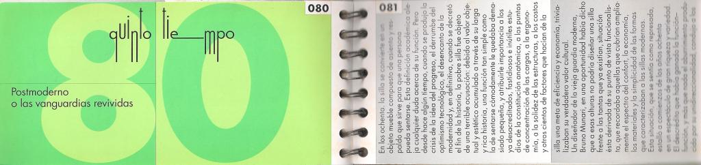 Un “Quinto tiempo” dedicado a los ochenta le permite a Sato subtitularlo como el del “Posmoderno o las vanguardias revividas”. La silla definida como un objeto mueble compuesto de asiento y respaldo “trasciende el mero hecho de sentarse y asume su verdadero papel de adorno doméstico” convirtiéndose en pieza de colección o “esculturas que se esconden tras el signo de la función”. Se recupera la sobriedad moderna arropada por el historicismo posmoderno que fija su mirada en el pasado aunque este no sea tan lejano. Clásicos de comienzos de siglo realizados por Charles Rennie Mackintosh, Josef Hofmann, los Hermanos Thonet, Gerrit Rietveld, Frank Lloyd Wright, Robert Mallet-Stevens, Marcel Breuer y Le Corbusier sirven de telón de fondo para ilustrar cómo la posmodernidad en Venezuela no se tradujo en el derrumbe de los paradigmas modernos ni un desencanto por la modernidad.