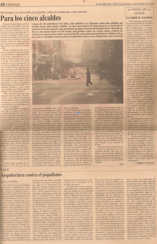 Toda esta intensa, rica y variada experiencia que vitalizó a buena parte del medio profesional y académico, así como los lineamientos estratégicos y las dificultades y tropiezos que acompañaron a la gestión de Istúriz, fueron seguidos con interés y atención por las diferentes páginas que en la prensa nacional se ocupaban de temas de arquitectura y ciudad, fenómeno particularmente relevante durante la década de los años 1990. Así, con diferentes grados de compromiso, frecuencia y enfoque, hemos podido detectar que las secciones dominicales de “Ciudad” o “Arquitectura y diseño” de El Diario de Caracas a cargo de Oscar Tenreiro y Farruco Sesto, de “Arquitectura” de El Nacional donde participan William Niño Araque, Hannia Gómez y Federico Vegas, y el encartado sabatino Arquitectura HOY coordinado por Juan Pedro Posani, van dando cuenta desde el llamado a elecciones municipales hasta el proceso que se desencadena luego de conocerse los resultados y se inicia la acción de gobierno, dentro de lo que consideran son sus respectivas responsabilidades divulgativas y de generación de opinión.