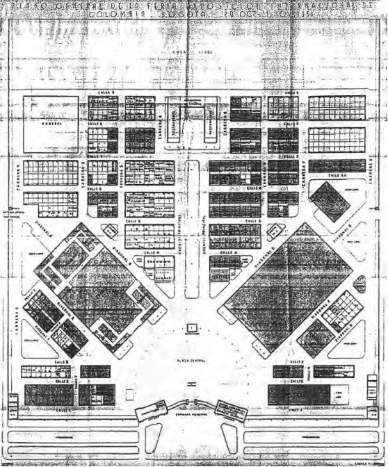 El recinto, organizado de acuerdo al plan maestro elaborado por el arquitecto Carlos E. Pérez Calvo (graduado en Bélgica) e Imre Von Mosdossy (“Experto en planeamiento y montaje de ferias internacionales”), construido con la ayuda del ejército nacional, fue trazado bajo un esquema claramente académico cuya plaza de entrada estaba presidida por dos imponentes pabellones en madera provistos por Nemaho. El conjunto “se ordenaba a partir de los dos ‘palacios’ de madera, dispuestos radialmente respecto del pórtico de acceso proto-tendenza (construido por Gabriel Puerta). Los frentes abovedados de estos hangares configuraban la plaza principal, respondiendo al eje de simetría que reforzaba una funambulesca marquesina (una doble ménsula, a modo de alas desplegadas, construida por Cemento Samper y Cemento Diamante). Esta pequeña estructura de concreto armado era el contrapunto estereotómico a la ciudadela tectónica, construida en solo 9 meses. (…) Si bien las estructuras de madera laminada no eran una novedad constructiva en Colombia, importadas desde 1939, las feriales eran las primeras urbanas y de uso público, mostrando a miles de personas sus ventajas. Más remarcable fue la iluminación a cargo de la empresa belga Éclairage Schréder (Fundada en Lieja, en 1907, también iluminó el Atomium de Bruselas’58), que empleó novedosas luces de mercurio y fluorescentes, produciendo un ambiente nocturno cosmopolita, en lo que había sido un potrero meses atrás”.