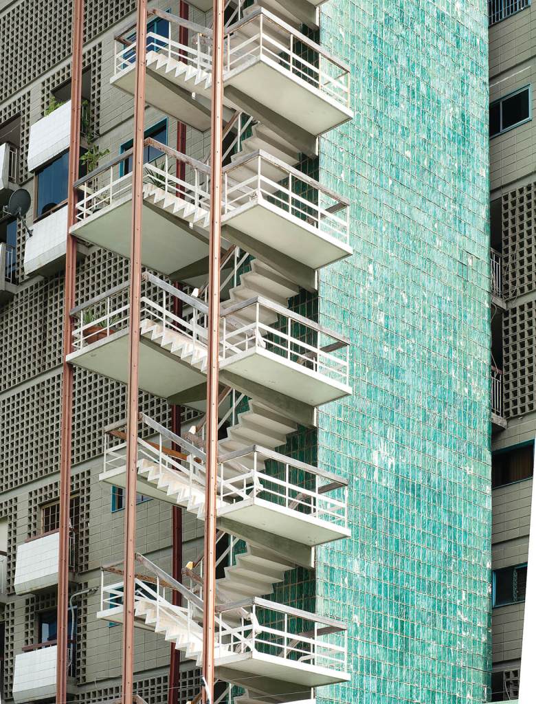 También cabe destacar como dato resaltante el impecable manejo y coordinación geométrica con la cual se proyectó el edificio: paredes construidas con bloques de concreto sin frisar, sólo pintados, en número exacto de piso a techo, al igual que los bloques de ventilación, dentro de cuyos paños se colocan los marcos para ventanas y puertas que conducen a los pequeños balcones cuyos antepechos prefabricados están enmarcados con barandas metálicas.