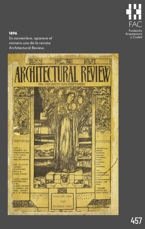 No son muchas las revistas de arquitectura de las que aún circulan con periodicidad que hayan aparecido por primera vez durante el siglo XIX. La británica Architectural Review fundada en 1896 es una de ellas, privilegio que comparte con la alemana Deutsche Bauzeitung (1867), el también inglés Architects’ Journal (1895) y la norteamericana Architectural Record (1896). Su constancia y su salida todos los meses, más allá de su calidad, se constituyen en sus puntos altos, lo que permite mantener a arquitectos de todo el mundo informados sin un gran desfase de tiempo.