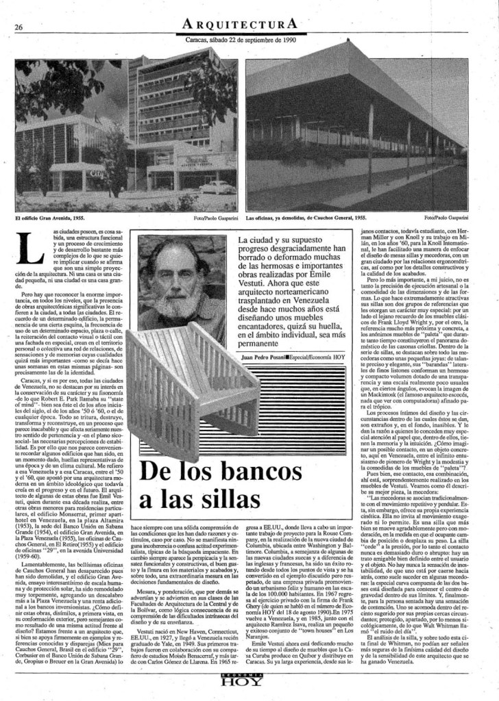 Finalmente, no podemos dejar de mencionar del artículo titulado “De los bancos a las sillas” escrito por Juan Pedro Posani para el diario Economía HOY publicado el sábado 22 de septiembre de 1990, donde por primera vez se hace un merecido reconocimiento al trabajo de Vestuti, el siguiente pasaje: