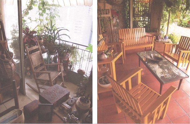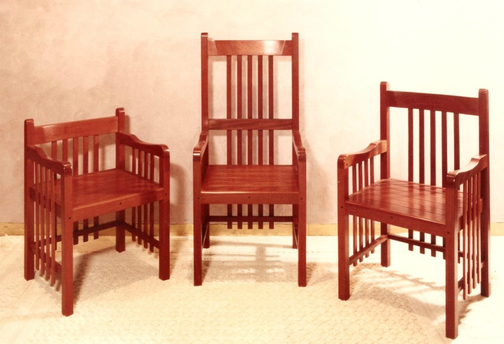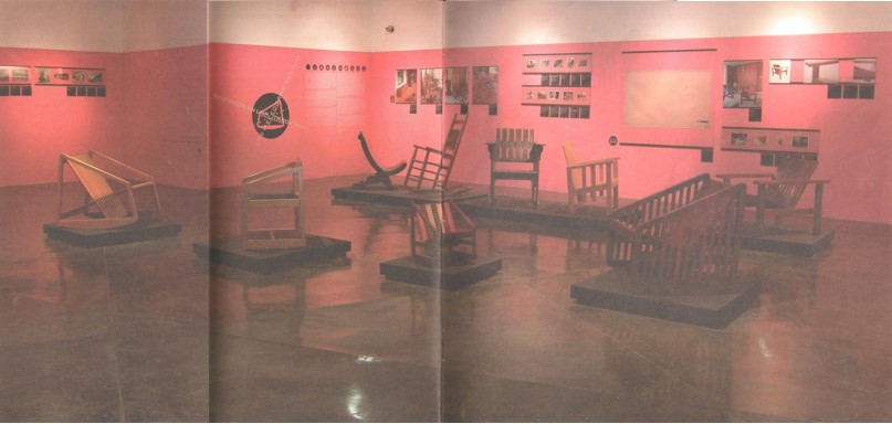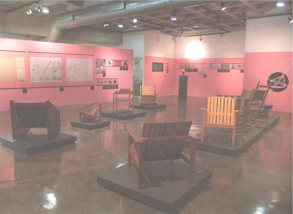Habiendo dejado clara la estructura de la muestra y el lugar desde donde se mira la obra expuesta, valdría la pena agregar que, para el montaje, ocupando el espacio central de la sala, las cinco sillas de Vestuti identificadas como Sillón 139 (1989), Mecedora 143 (1989), Mecedora 197 (1991), Silla IVIC (1993) y Mecedora 281 (1996-1998), estuvieron acompañadas de otros cuatro muebles tradicionales: un ture o butaca, una mecedora y dos asientos de paleta versión Casa Curuba.