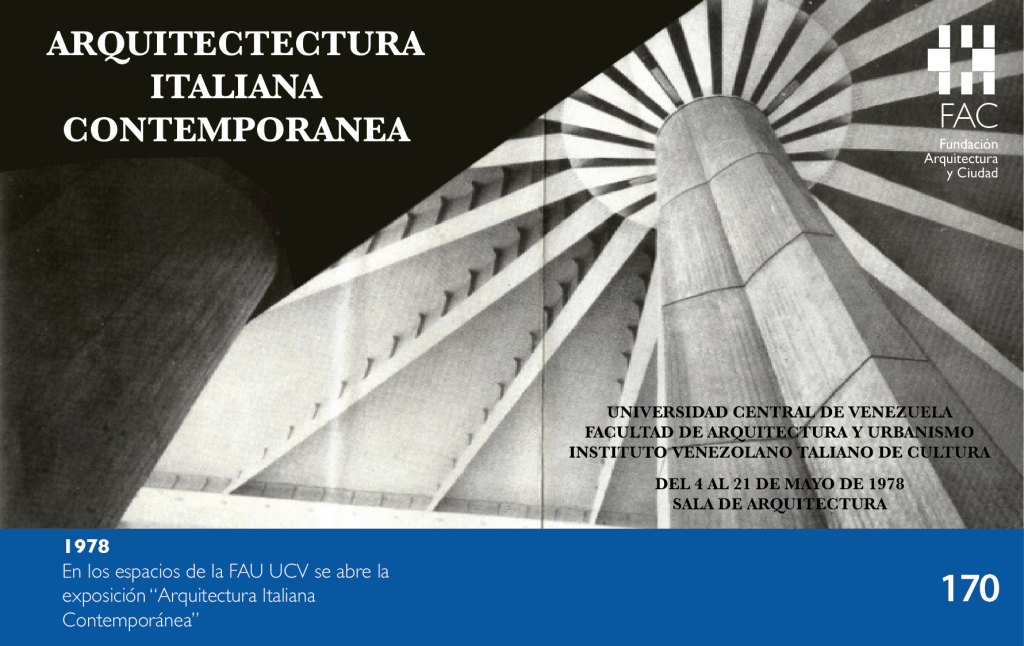 Con la exposición “Arquitectura Italiana Contemporánea” se cierra un ciclo de 21 años de gestión de Antonio Granados Valdés al frente de la División de Extensión Cultural (1957 y 1978) de la Facultad de Arquitectura y Urbanismo de la UCV. Aunque para ese momento ya había sido creado (1976) el Centro de Información y Documentación (CID) por el decano Américo Faillace, éste convino con Granados, hasta tanto no cumpliese los años que le permitiesen jubilarse, relegarlo de las tareas que implicaban reestructurar y crear un verdadero sistema de información y documentación dentro de la institución y mantenerlo al frente de la revista Punto y la Colección Espacio y Forma, así como del montaje de aquellas exposiciones programadas con anterioridad, entre las cuales se encontraba la que hoy nos ocupa.