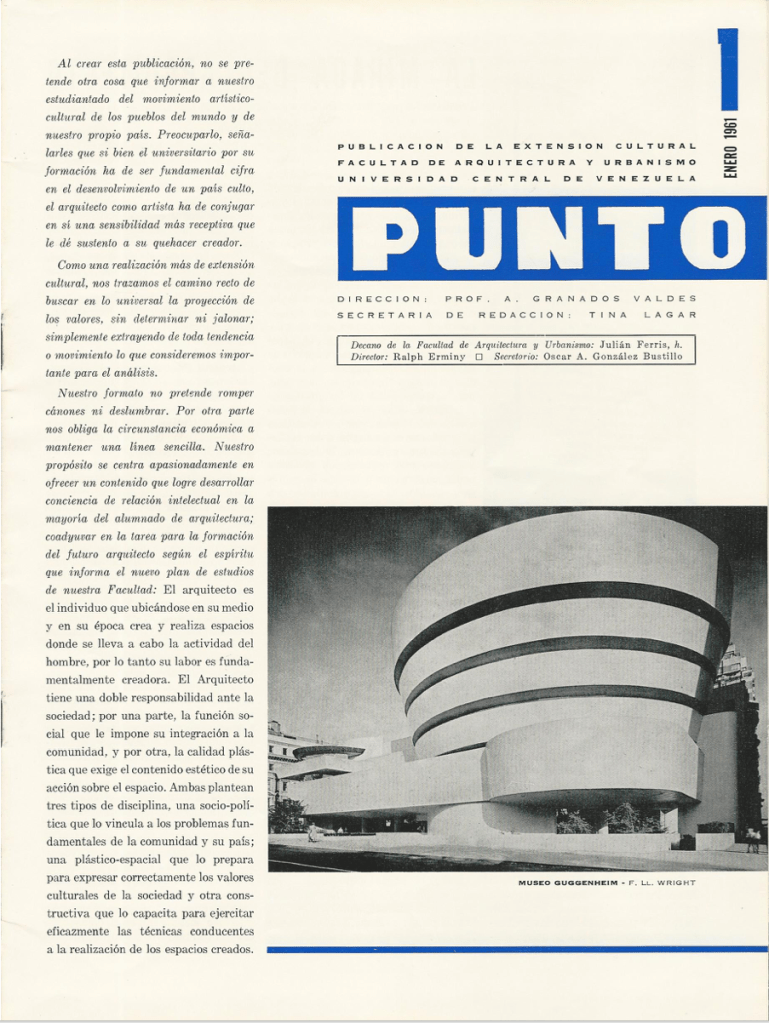 La revista Punto, considerada durante muchos años la publicación periódica bandera de la Facultad de Arquitectura y Urbanismo de la UCV, aparece en enero de 1961 durante el decanato de Julián Ferris, casi 8 años después de creada esa institución y 20 después de que la Escuela de Arquitectura iniciara sus actividades. Su fundador y primer director, Antonio Granados Valdés (1917-2020), ingresa a la Universidad como docente en 1957 para coordinar un área que recién empezaba a desarrollarse denominada “Extensión Cultural”, sustituyendo a Abel Vallmitjana (1910-1974), pintor catalán y al igual que Granados exiliado republicano, quien lo introduce ante el entonces decano de la FAU y Vicerrector de la UCV Willy Ossott para proponerlo como su reemplazo.