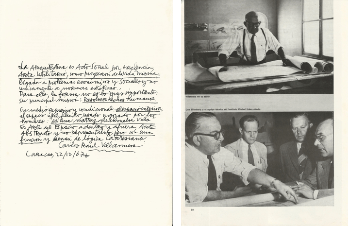 Dentro de la misma línea didáctica, en la revista se recogen datos biográficos, fotos que testimonian momentos importantes de su trayectoria y algunas semblanzas y artículos que analizan el aporte del Maestro de mano de algunos de sus más directos colaboradores y discípulos, así como de estudiosos de su trabajo quienes resaltan, por encima del valor incuestionable de su obra, los más variados aspectos de su personalidad creadora y la importancia de su aporte en el desarrollo cultural del país. Precedidos por un sentido relato elaborado por Granados donde pone en evidencia su aprecio y admiración por Villanueva, los textos “Una ciudad de todas las artes en Venezuela” de Sir John Rothenstein (Director de la Tate Gallery, Londres), “La arquitectura de Villanueva” de Ricardo Porro, “Aula Magna” de Juan Pedro Posani, “Análisis de la obra arquitectónica de Carlos Raúl Villanueva” de Rodolfo García Pablos, “Es uno de los jóvenes de mayor edad…” de Américo Faillace, “Villanueva” de Julio Coll Rojas, “A propósito del homenaje al doctor Carlos Raúl Villanueva” de Gorka Dorronsoro y “Acepto que…” de Juan Pedro Posani, sumados a los mensajes “La arquitectura es Acto Social por excelencia…” y “Jóvenes estudiantes de nuestra muy querida Universidad” (especialmente redactado para Punto 46), junto a “La arquitectura, sus razones de ser. Las líneas de su desarrollo”, “Tendencias actuales de la arquitectura”, “La ciudad del pasado, del presente y del porvenir”, “Algunas observaciones del desarrollo actual de la Arquitectura Iberoamericana” y “Reflexiones personales”, escritos por Villanueva y publicados con anterioridad en la revista (que en su totalidad ya habían sido recopilados en los números 3 y 13 de la Colección Espacio y Forma de octubre de 1960 y agosto de 1965, respectivamente), ofrecen una panorámica completa del personaje acorde con los objetivos trazados por el editor.