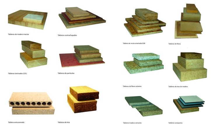 A riesgo de repetirnos en algún momento podemos, de acuerdo a http://www.cscae.com/area_tecnica/aitim/actividades/act_paginas/libro/09%20tableros%20en%20general.pdf, afirmar que los tableros, afirmar que los tableros, cuyo principal reto ha sido siempre superar sus dificultades en cuanto a la resistencia al agua, pueden clasificarse según el recubrimiento de las caras en: desnudos, recubiertos, acabados y rechapados. Por el formato de la madera en: de madera maciza, de chapas (contrachapados y laminados), de partículas (a base de partículas de madera -incluyendo también cáñamo, lino, bagazo y similares-), de lino (a base de partículas de madera más otras de diferente tipo -lino, bagazo, paja, etc.- en un porcentaje especificado), de virutas y de fibras.