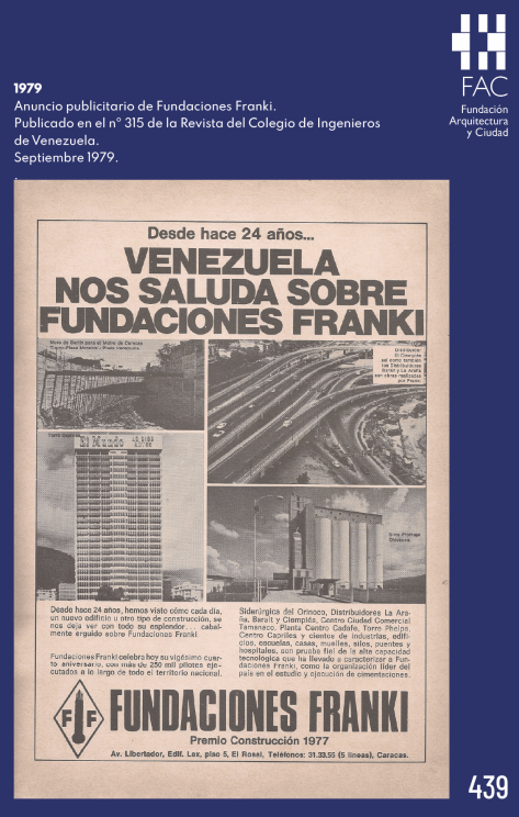 Fundaciones Franki que para la década de los años 1970 encabezaba por encima de Soletanche (que operaba en Venezuela desde 1953) y Bachy y Asociados S.A. el competido mercado de cimentaciones profundas en la muy activa industria de la construcción venezolana, había participado en obras tales como: la Siderúrgica del Orinoco, los Distribuidores La Araña, Baralt y El Ciempiés, el Centro Ciudad Comercial Tamanaco, Planta Centro CADAFE, la Torre Phelps, el Centro Capriles, los muros de contención que se construían para el tramo subterráneo Plaza Morelos-Plaza Venezuela del Metro de Caracas y más de un centenar de industrias, edificios, escuelas, casas, muelles, silos, puentes y hospitales, de acuerdo a lo señalado en el anuncio.