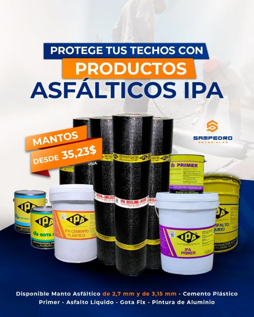 “Mantos asfálticos: IPA produce membranas compuestas de asfalto modificado con polímeros y reforzada con fibra de vidrio, utilizadas para impermeabilizar diversas superficies como techos, terrazas y cimientos”.
