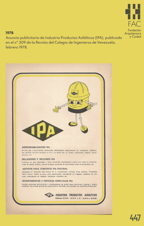La postal que el día de hoy nos ha permitido repasar este tema muchas veces subvalorado, se encuentra ilustrada con un anuncio publicado en 1978 por Industria de Productos Asfálticos (IPA), empresa venezolana todavía con importante presencia en el mercado y que con más de 80 años de experiencia ofrece soluciones de impermeabilización y productos asfálticos, por lo que ocupa sólo un segmento del amplio espectro que en torno a tópico hemos desplegado. El aviso menciona la producción por parte de IPA de: impermeabilizantes, selladores y rellenos, aditivos para concreto y revestimientos y pinturas especiales.