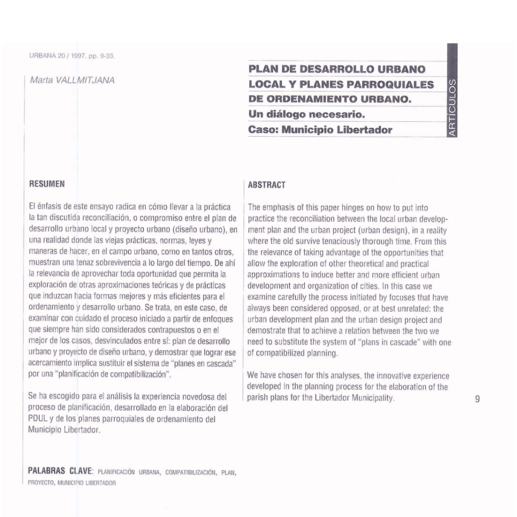 3. Resumen del artículo de Marta Vallmitjana “Plan de Ordenamiento Urbano Local y Planes Parroquiales de Ordenamiento Urbano. Un diálogo necesario. Caso: Municipio Libertador”, aparecido en la revista Urbana nº 20 (1997).