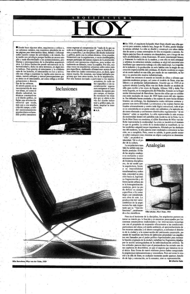 A casi tres años de su aparición (el número 1 es del 2 de mayo de 1992), el semanario Arquitectura HOY, que circulaba encartado en el diario Economía HOY y cuya coordinación general estaba a cargo de Juan Pedro Posani acompañado desde el comité de redacción por Alberto Sato, Azier Calvo, Henrique Vera y Enrique Fernández-Shaw, toma la decisión de dar cabida a partir del número 48 a la publicación en sus páginas de temas que fuesen más allá de la disciplina arquitectónica, a la cual había dedicado casi exclusivamente sus 47 entregas anteriores. Será Alberto Sato, en una breve nota editorial titulada “Inclusiones”, quien explique cómo entre los responsables de redactar la página, que ya se había posicionado como espacio amplio y nada discriminado de intercambio de ideas, debate e información en torno a la arquitectura, cuya única limitación podría haber sido la hermeticidad y la presencia de algún que otro texto tedioso, surge el interés, impulsado por el entusiasmo y colaboración con los lectores, de incorporar nuevos temas de entre los que destacarían el diseño industrial, las técnicas constructivas y el diseño gráfico.