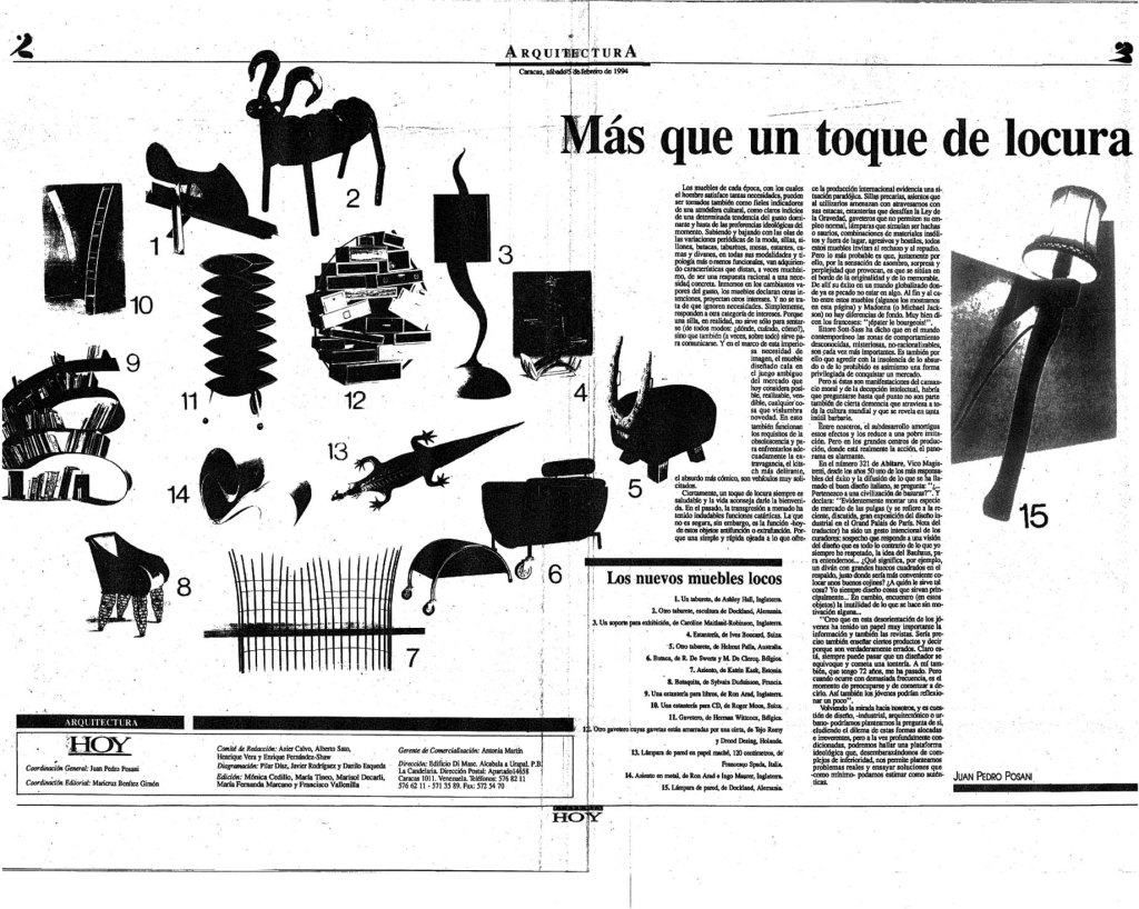 El otro artículo dedicado al diseño industrial, que ocupa en este caso las páginas centrales del semanario, estaría a cargo de Juan Pedro Posani con el título “Más que un toque de locura”. Allí, observando el panorama internacional y ante el despliegue inusitado de objetos que asemejan cualquier cosa menos para lo que pueden servir (claro síntoma del momento que se vive), Posani, al igual que Sato, basará su discurso en torno al significado que encierra la elaboración de cualquier producto salido de la mano de connotados diseñadores. “Subiendo y bajando con las olas de las variaciones periódicas de la moda, sillas, sillones, butacas, taburetes, mesas, estantes, camas y divanes, en todas sus modalidades y tipología más o menos funcionales, van adquiriendo características que distan, a veces muchísimo, de ser una respuesta racional a una necesidad concreta. Inmersos en los cambiantes vapores del gusto, los muebles declaran otras intenciones, proyectan otros intereses. Y no se trata de que ignoren necesidades. Simplemente, responden a otra categoría de intereses. Porque una silla, en realidad, no sirve sólo para sentarse…, sino que también sirve para comunicarse”.