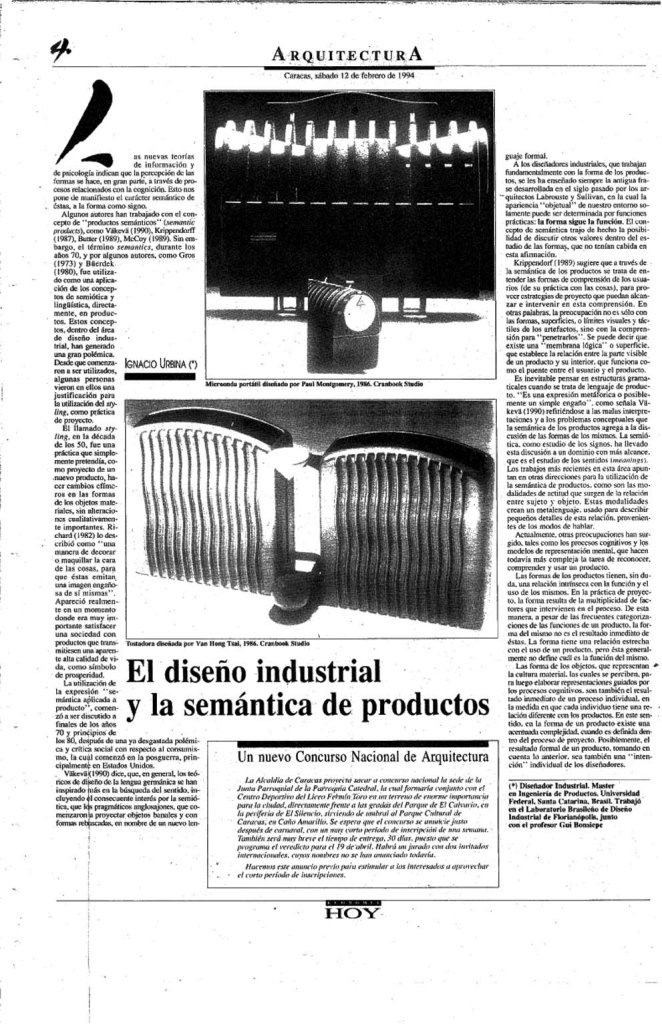 El anuncio hecho por Sato de solicitar colaboraciones para el semanario de «sujetos que conocieran a fondo su saber específico», tendrá su primera manifestación en el nº49 de Arquitectura HOY (12 de febrero de 1994), cuando aparecerá la firma del diseñador industrial Ignacio Urbina Polo escribiendo, en tono complementario a lo señalado por Sato y Posani una semana antes, el artículo “El diseño industrial y la semántica de los productos”. Urbina Polo, egresado del Instituto Antonio José de Sucre, quien para entonces recién llegaba de Brasil tras realizar una Maestría en Ingeniería de Productos y en 1996 empezó a ejercer la docencia en Prodiseño, Escuela de Comunicación Visual y Diseño, fundada en 1990 que recogió la línea abierta en 1964 por el pionero Instituto de Diseño Neumann y hoy Profesor Asociado a tiempo completo en el Departamento de Diseño Industrial del Pratt Institute en New York, asumió con dedicación y rigor su compromiso, apareciendo en Arquitectura HOY 9 veces durante 1994 y otras 8 entre 1995 y 1996 sumando en total 22 hasta 1998.