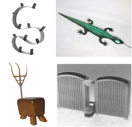 7. Izquierda. Arriba: Ron Arad. Estantería (1990). Abajo: Helmut Palla. Silla Berrendo (2001, de GymnasticFurniture). Derecha. Arriba: Francesco Spada. Lámpara (1993). Abajo: Van Hong Tsai. Tostadora. (1986)