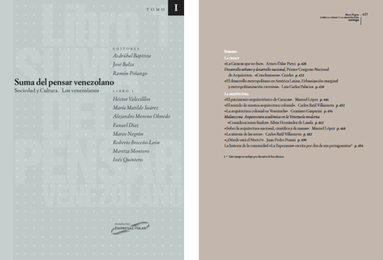 2. Izquierda: Portada del Tomo I (Sociedad y cultura), Libro I (Los venezolanos) de Suma del Pensar Venezolano. Derecha: Sumario del capítulo “Sobre la ciudad y la arquitectura” donde se muestra la lista de los textos seleccionados por Marco Negrón.