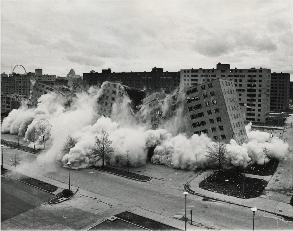 Al mismo tiempo que la fotografía de Gautherot registraba literalmente la construcción de la arquitectura moderna, otras fotografías marcan lo que se consideraría su final. Diseñada por Minoru Yamasaki, la icónica urbanización Pruitt-Igoe es considerada un hito de la arquitectura modernista: con casi 3.000 unidades, el proyecto pretendía cubrir casi la mitad del déficit habitacional señalado por el gobierno en la década de 1950 en St. Louis, Estados Unidos. El declive del proyecto comenzó después de que terminaran las obras, en 1955, y menos de 20 años después, en julio de 1972, se completó la primera etapa de demolición del conjunto, ampliamente registrada en videos y fotografías.