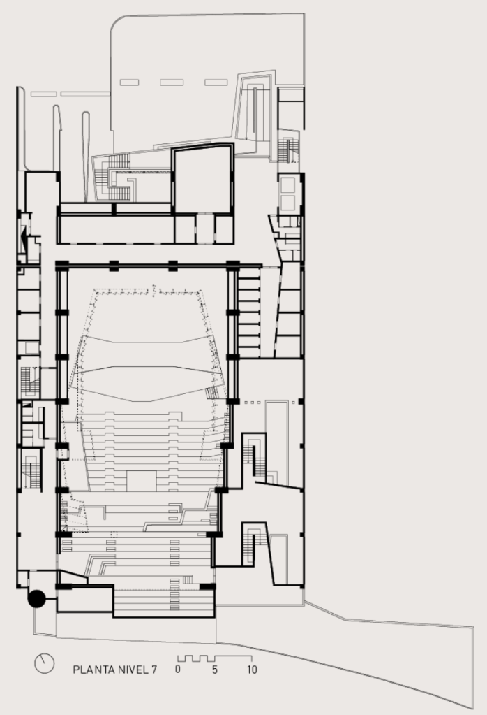 Su austera materialidad exterior en hormigón y bloques a la vista, contrasta con la fineza que se refleja en el uso de la madera y materiales nobles en el interior de la gran sala y los auditorios.