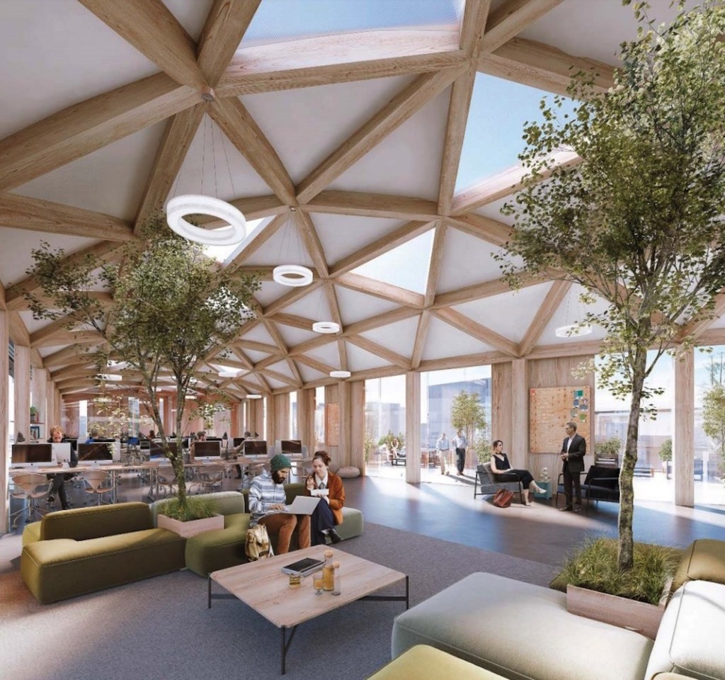 La estructura estaría hecha predominantemente de madera laminada cruzada resistente al fuego (CLT). Las placas de piso, las columnas estructurales y los exteriores usarán materiales de madera, mientras que se incorpora un núcleo de concreto que contiene los ascensores y la escalera de emergencia para la seguridad sísmica y contra incendios.
