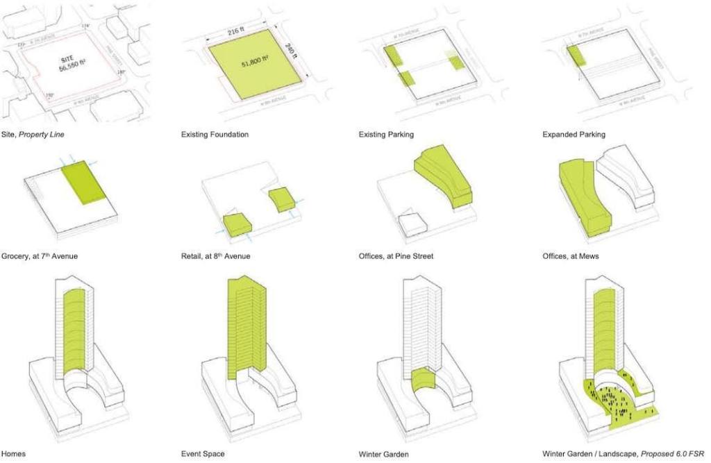 Langereis comenzó una colaboración con Peter Busby en Perkins + Will hace cinco años con un diseño de rascacielos que contempla alrededor de 200 viviendas. Cada sección de tres pisos de la cara sur de la torre contendrá un jardín exterior accesible para los residentes. Abajo, el podio del complejo conllevaría espacios de oficinas premium, restaurantes y tiendas que abastecen de alimentos. Todo esto, alineado en un amplio patio que se abre a la avenida West 8th.