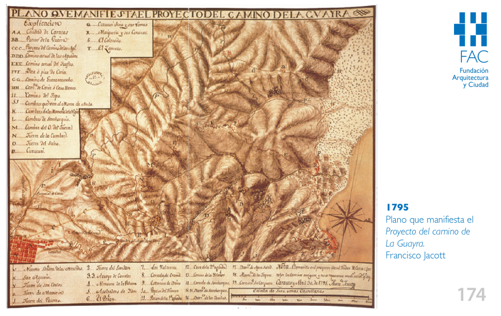 En la parte superior izquierda, siguiendo el orden que da el uso del abecedario, identifica de entrada la localización de los dos puntos que se busca conectar: la “Ciudad de Caracas” (AA) -ubicada abajo y a la izquierda del plano- y el “Puerto de la Guaira” (BB) -abajo a la derecha-. Cobrando un subsiguiente nivel de jerarquía, todos relacionados con vías de comunicación, aparecen el “Proyecto del Camino de las Aguadas” (CCC) -parte fundamental de la propuesta de Jacott-, el “Camino actual de las Aguadas” (DDD) , el “Camino actual del Tráfico” (EEE) y la “Zoca o pica de Caria” (FFF), pasando luego a un tercer nivel en el que se ubican el “Camino de Guaracarumbo” (GG), el “Camino de Catia o Cavo Blanco” (HH), el “Camino del Topo” (II) y las “Cumbres que van al Monte de Avila” (JJ). A partir de la letra “K” y hasta la “T” se van señalando diferentes puntos de referencia todos relacionados con el tradicional camino que unía La Guaira y Caracas a partir de Maiquetía.