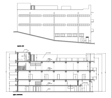 La preeminencia de la fachada principal (norte) es clara con relación a la este y la sur tratadas con el uso de ventanas continuas que remarcan la horizontalidad y a la vez dotan de iluminación las áreas de oficinas y servicios ubicadas en las plantas 1 y 2.