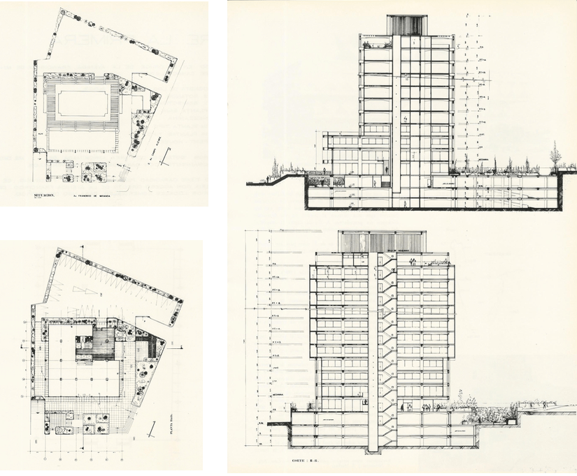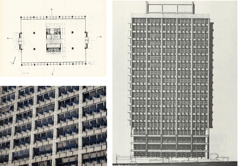 La arquitecto Bentata planteó el núcleo de circulación y de servicio del edificio en el centro de la planta, decisión que facilitó la sub-división de las oficinas y el uso de los 3 ascensores más uno de carga, la escalera, ductos de basura y los sanitarios.