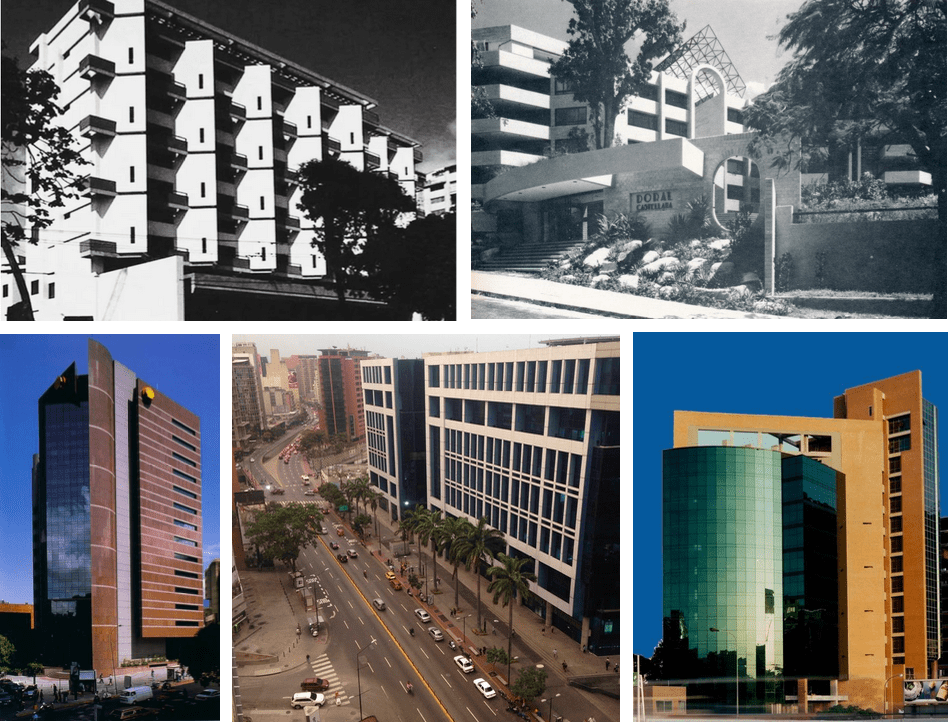4. Cinco edificio de Celina Bentata realizados en diferentes momentos, todos en Caracas. Arriba izquierda: Residencias Aldoral, Los Palos Grandes, 1984. Arriba derecha: Conjunto residencial Doral Castellana, La Castellana, 1988. Abajo izquierda: Torre Shell (hoy BFC), El Rosal, 1990. Abajo centro: Centro Lido, Av. Francisco de Miranda, El Rosal, 1989. Abajo derecha: Torre Banesco, El Rosal, 1991.
