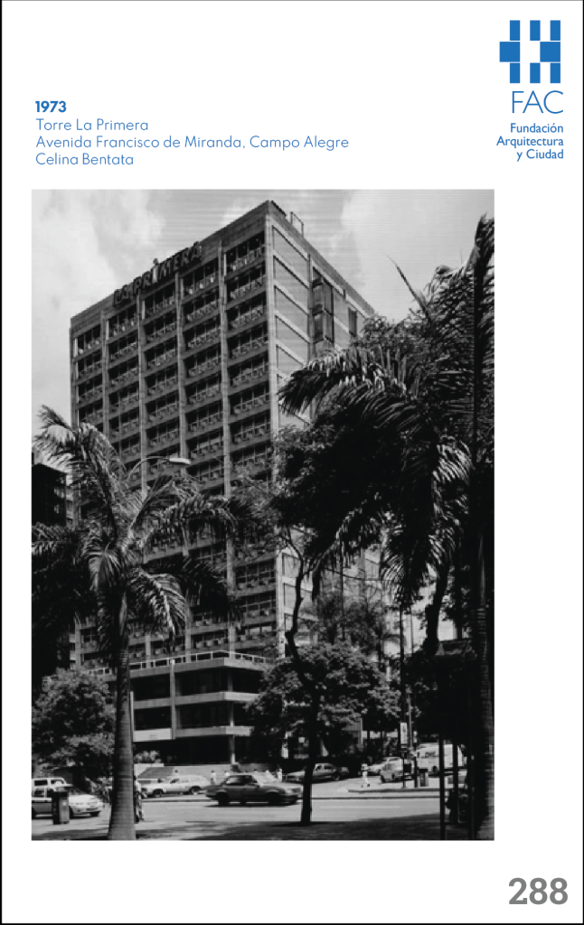 1973• Se termina la construcción y empieza a ser ocupado el edificio de oficinas Torre La Primera, ubicado en el cruce de la Av. Francisco de Miranda con la 2º Av. de la Urbanización Campo Alegre, diseñado por la arquitecto Celina de Bentata (FAU UCV, promoción 11 B/1961). El edificio tiene 2 sótanos (que albergan 190 vehículos); un semisótano; planta baja y mezzanina, las cuales son la sede de La Primera Entidad de Ahorro y Préstamo; una primera planta tipo, con terraza; catorce plantas tipo que conforman la torre con 700 m2 cada una y como remate un pent-house.