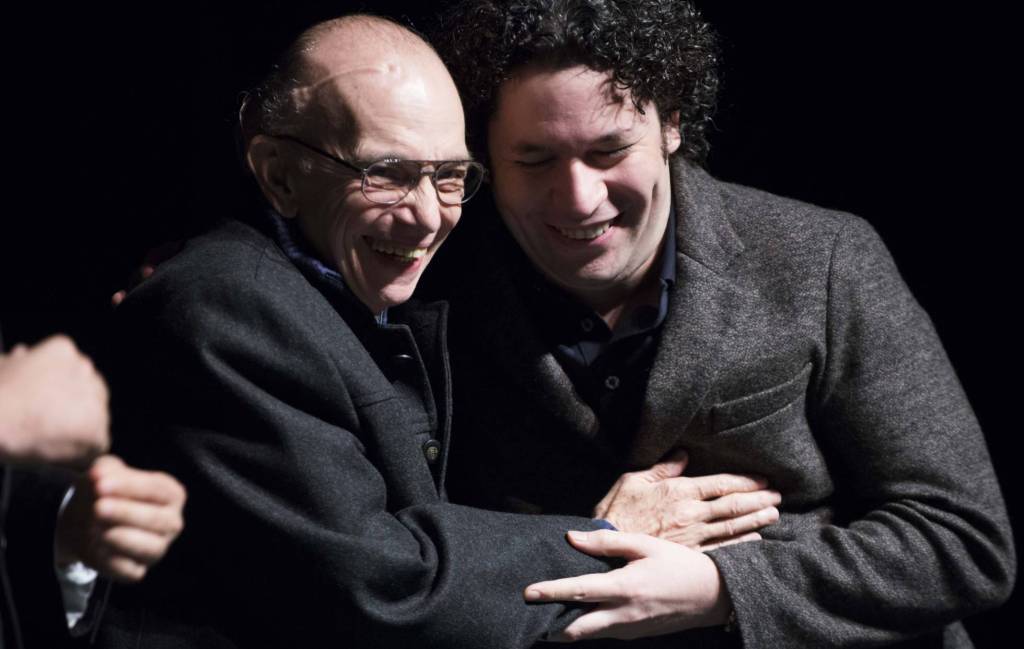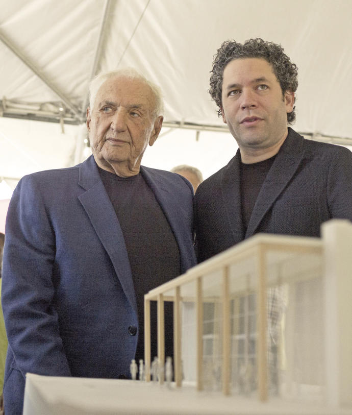 La irrupción de Gehry en la escena venezolana está absolutamente ligada a las figuras de José Antonio Abreu (Valera, estado Trujillo,1939-Caracas, 2018), músico, economista, político, activista y educador, fundador en 1975 de la Orquesta Sinfónica Nacional Juvenil y la Fundación del Estado para el Sistema Nacional de las Orquestas Juveniles e Infantiles de Venezuela (FESNOJIV), que tiene como su máxima expresión la Orquesta Sinfónica de la Juventud Venezolana Simón Bolívar (fundada en 1979); y de su más dilecto discípulo, Gustavo Dudamel (Barquisimeto, 1981), músico y compositor, el más notorio ejemplo de la excelente formación que provee lo que se ha conocido como “El Sistema”, nombrado en 1999 director de música de la Orquesta Sinfónica Simón Bolívar y de la Orquesta Sinfónica Nacional de la Juventud de Venezuela, y desde 2009 hasta hoy rutilante director musical de la Orquesta Filarmónica de Los Ángeles (LA Phil).