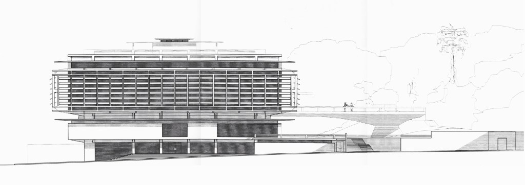 La potente proposición arquitectónica presentada por Acosta y Jubes apeló a la idea de resolver en un solo contenedor todas las funciones exigidas por los organizadores del concurso, el cual se elevaría para lograr una plaza de acceso sobre la avenida Panteón y sería envuelto por una piel de romanillas que garantizaría la uniformidad de lectura de los dispares usos que conformaban el programa. En otras palabras, la ampliación fue concebida como gran puerta de entrada al Museo de Arte Colonial. En los niveles inferior y superior del edificio se colocarían las áreas complementarias y rentales, respectivamente, ocupando el grueso del volumen el estacionamiento. En la transición entre la base y el bloque suspendido se establecería la conexión con el museo la cual también podría ser accesible independientemente desde la plaza de entrada.