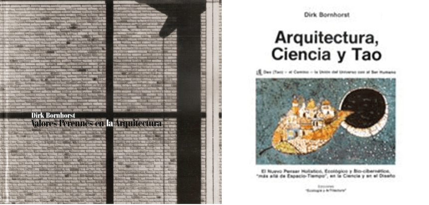 1. Dos de los libros escritos por Dirk Bornhorst: Valores Perennes en la Arquitectura (2001) y Arquitectura, Ciencia y Tao: el nuevo pensar ecológico, bio-cibernético y holístico, más allá de espacio-tiempo, en la ciencia y en el diseño (1999).