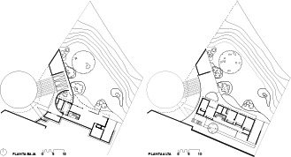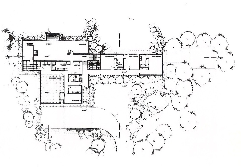 La quinta “Las Mercedes” (cuya extraordinaria foto de Paolo Gasparini ilustra nuestra postal del día de hoy), se concibe y resuelve, dentro de la saga que hemos señalado, en una planta lo que lleva a los proyectistas a modificar el terreno donde se implanta creando un plano horizontal 3 metros sobre el nivel de la calle para el desarrollo de la vivienda, quedando sólo a nivel 0 el garaje, resolviéndose el acceso a través de una elegante escalera. La casa cuenta con una ligera cubierta que define la entrada la cual está acompañada de un acogedor jardín que conduce hasta la puerta principal. Luego, una vez dentro, se define un vestíbulo que permite dirigirse independientemente a las tres zonas que la conforman: la social, constituida por un estar separado del comedor por puertas que se recogen; la de servicios, que cuenta con cocina-pantry, habitación de servicio, baño y patio de faenas y secado con acceso independiente desde la calle; y la más íntima, conformada por un estudio y tres habitaciones, con dos baños, uno de ellos incorporado. Las tres habitaciones tienen salida a un amplio jardín, pleno de frondosos árboles, y el área social a otro más reducido que mira hacia la calle. Cuidado en los detalles, sabio uso de los materiales y aprovechamiento de sus diferentes texturas a favor de un sensible juego volumétrico en el que el muro pasa a ser tema de diseño y la luz y la sombra sus mejores acompañantes, se dan cita gracias a una correcta orientación que además contempla la ventilación cruzada.