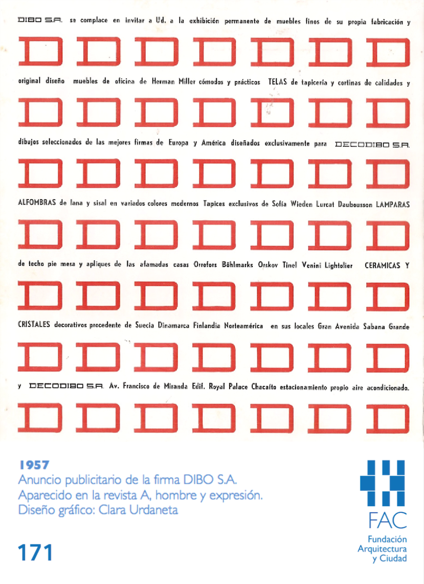 Elina Pérez Urbaneja señala más adelante en su texto cómo durante ese período “también se radicaron en Venezuela el austríaco Rudolf Steiskal y el arquitecto estadounidense Emile Vestuti, este último contratado con la finalidad de apoyar el diseño y producción de la fábrica Decodibo” (hay que recordar que Vestuti llega a Venezuela contratado por Guinand y Benacerraf con quienes también trabaja como arquitecto en su oficina), síntoma de que la empresa que hoy nos ocupa competía al más alto nivel con las de su ramo. A ese momento pertenece también la página de propaganda preparada en 1957 para la revista A, hombre y expresión por Clara Urdaneta que, utilizando la letra “D” como motivo identificativo de la firma, engalana nuestra postal del día de hoy.
